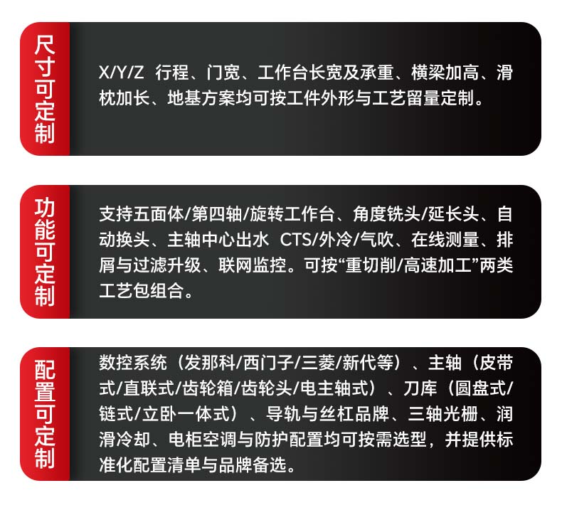 乔那科数控定制化龙门加工中心,采用模块化设计理念,可根据客户工件尺寸、工艺特点与生产需求进行模块化选配